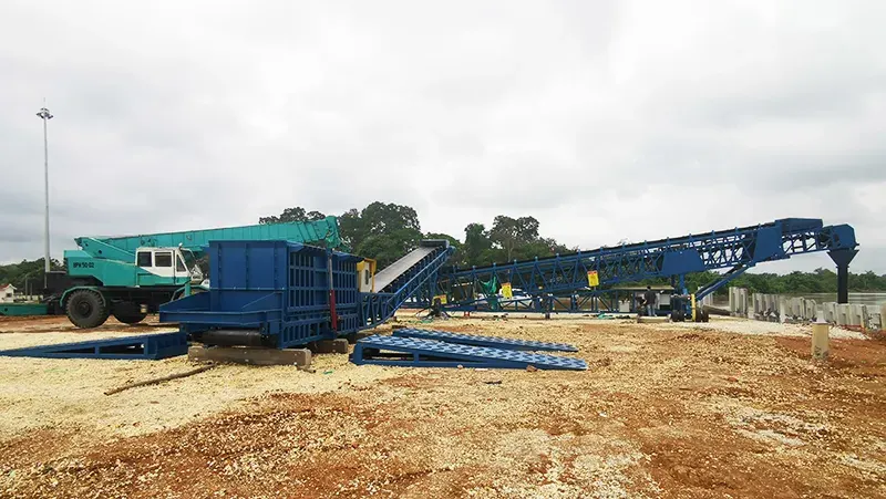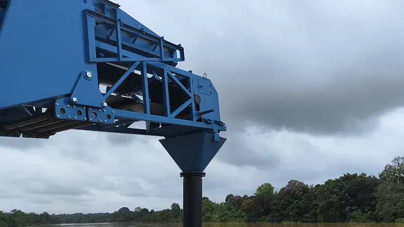 The ship loading project in Jambi, Indonesia, demonstrates an integrated solution for efficient coal handling. Designed with a rated capacity of 1,000 t/h, this system is suitable for bulk material with densities of approximately 900 kg/m³. The entire system uses a 1,000 mm belt width and an adjustable belt speed of 0 to 3.15 m/s, ensuring stable conveying and high-efficiency operation. The maximum overall length of the equipment is approximately 33 meters, including a telescopic stroke of up to 10.5 meters, allowing flexible adaptation to different vessel types and loading positions. During ship loading operations, the maximum stacking height reaches 10 meters. The equipment offers a luffing angle range of 7°–17° and a slewing angle of 270°, greatly expanding the operational coverage area. The system's total installed power is around 80 kW, providing a balance between conveying capacity and energy efficiency. This makes it suitable for continuous, high-frequency ship loading operations at ports.