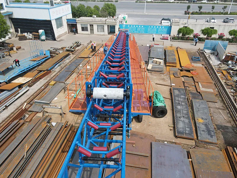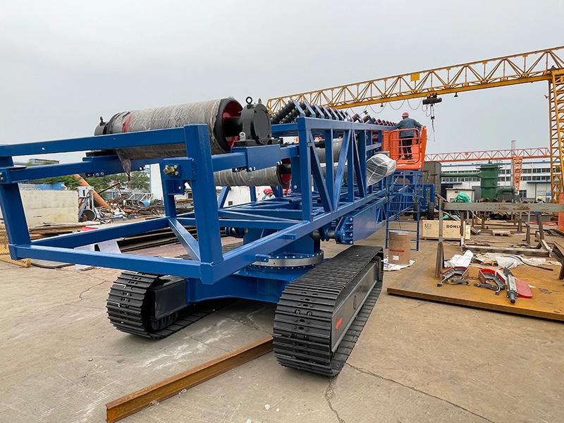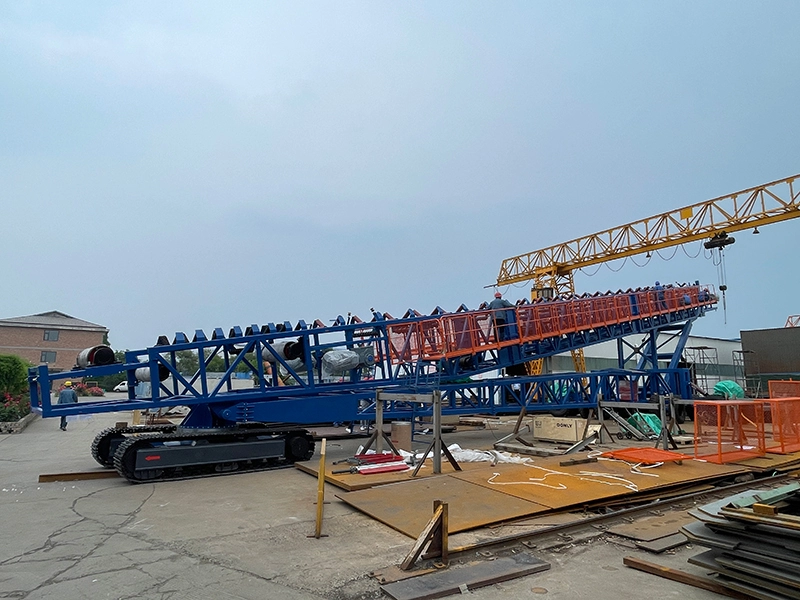 The system includes a fixed belt conveyor section, telescopic belt conveyor, material chute, lifting support structure, conveyor support axle, front travel mechanism, rear crawler travel mechanism, and dual-side walkways. It supports telescopic extension, circular stacking, pitch angle adjustment, and forward-backward movement, ensuring flexible and reliable material handling operations.