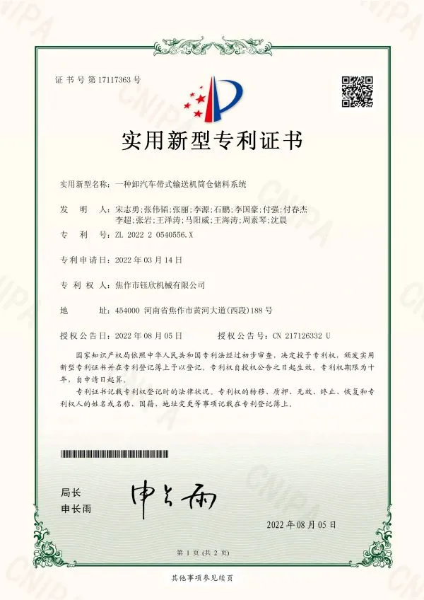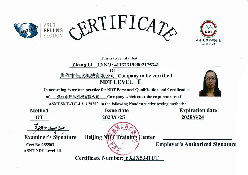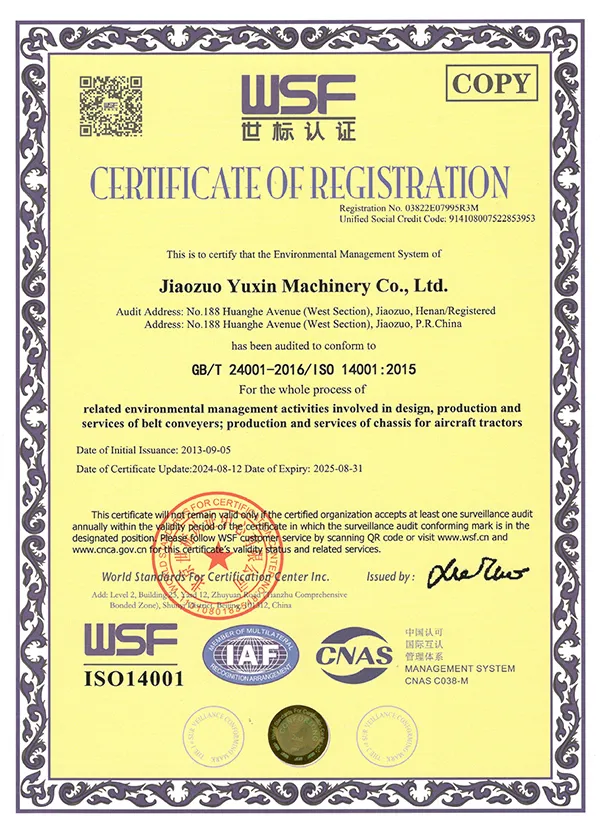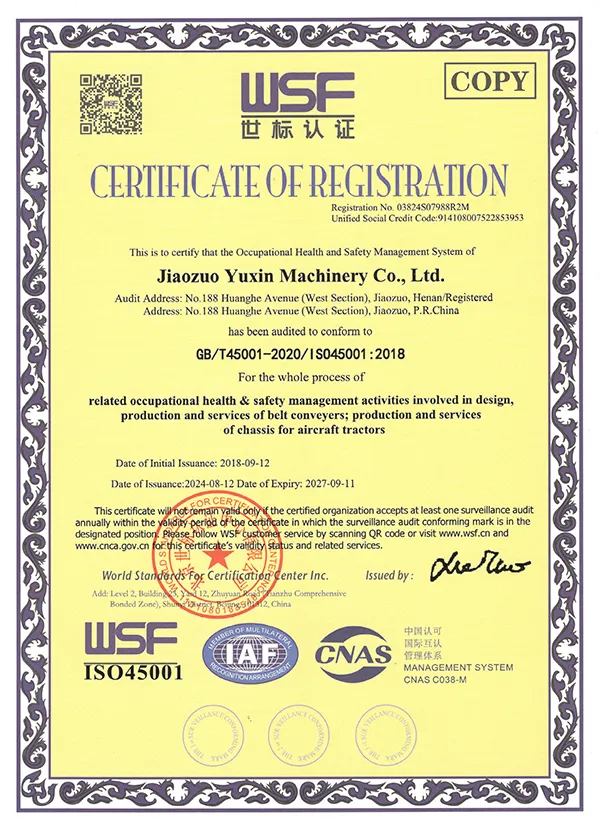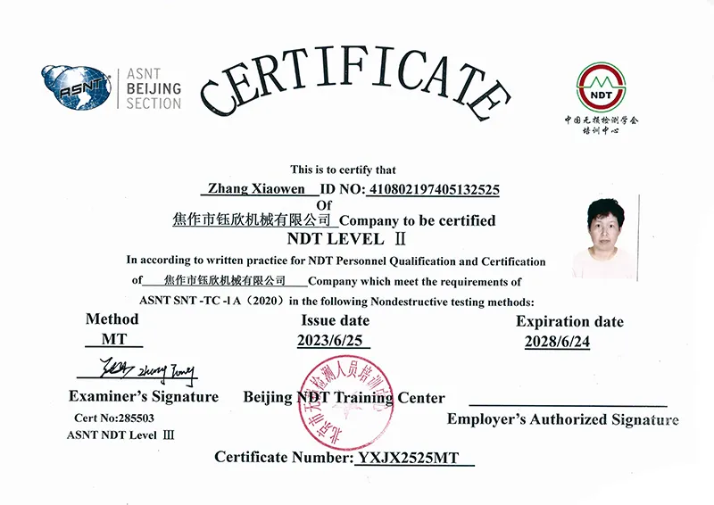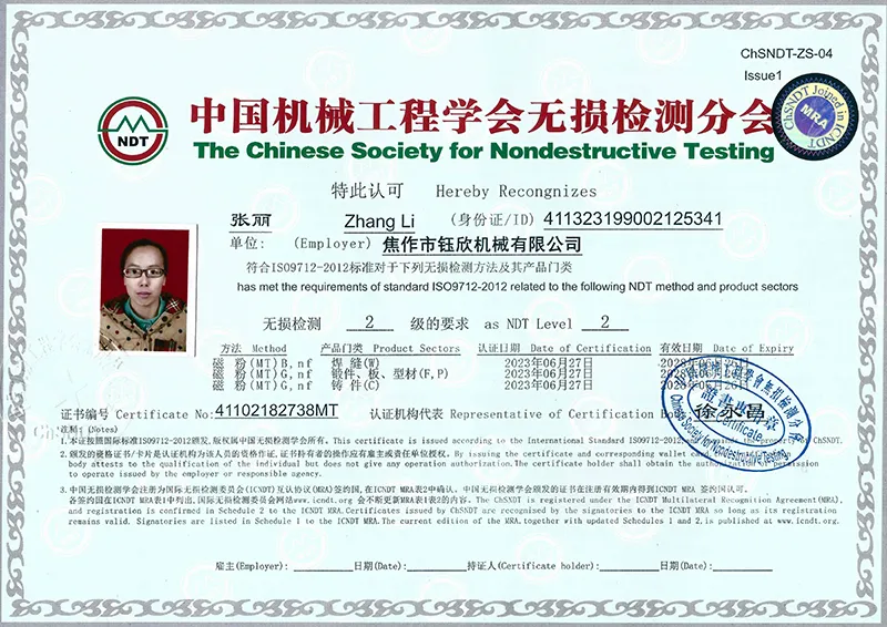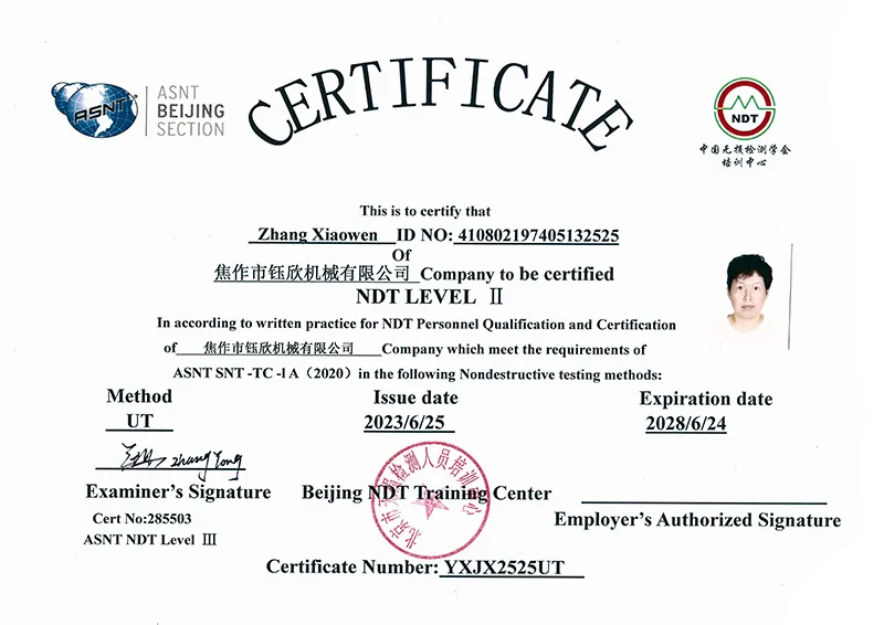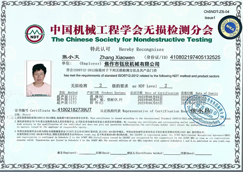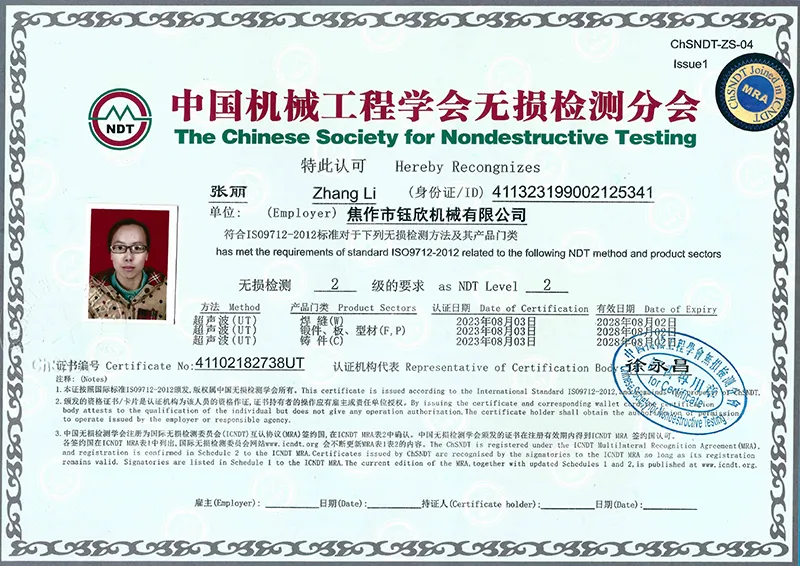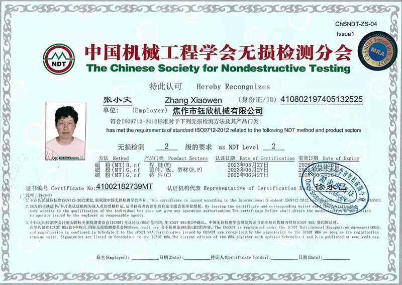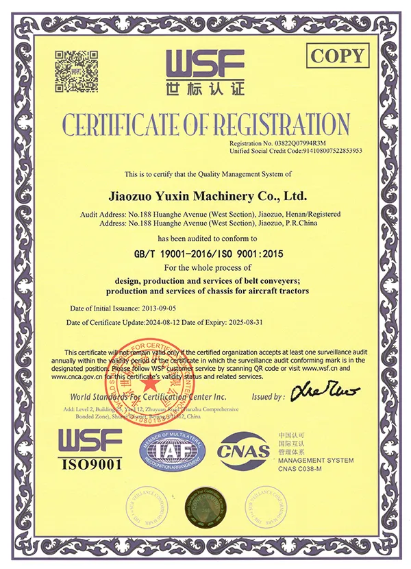 Yuxin Machinery is proud to have a team of professional inspectors certified in ultrasonic testing and magnetic particle testing.This expertise is backed by various international certifications, ensuring the highest quality and safety standards for our material handling solutions.