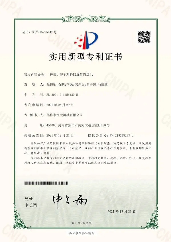Patent for convenient belt conveyor for unloading trucks and discharging materials