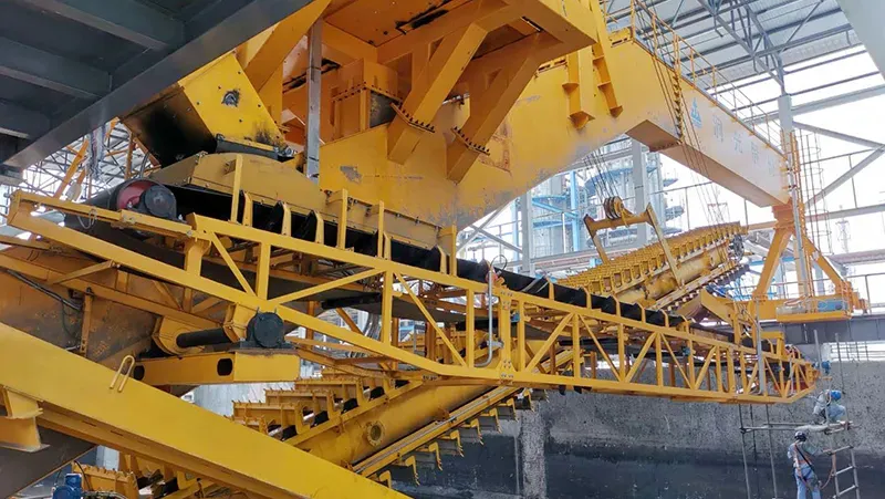 The project includes a total of 8 belt conveyors, with a total conveyor length of 290 meters, and one truck loading system. These conveyors are capable of conveying 500 tons per hour with a width of 1,000 mm and a speed of 2 m/s. The system includes one truss-type reversible conveyor, one truss-type stacking conveyor, two reversible bin-feeding conveyors with a belt width of 1,200 mm, and the remaining conveyors are intermediate frame conveyors. The unloading equipment includes one fixed double-sided unloader, one fixed right-sided unloader, and one single-sided mobile unloader.